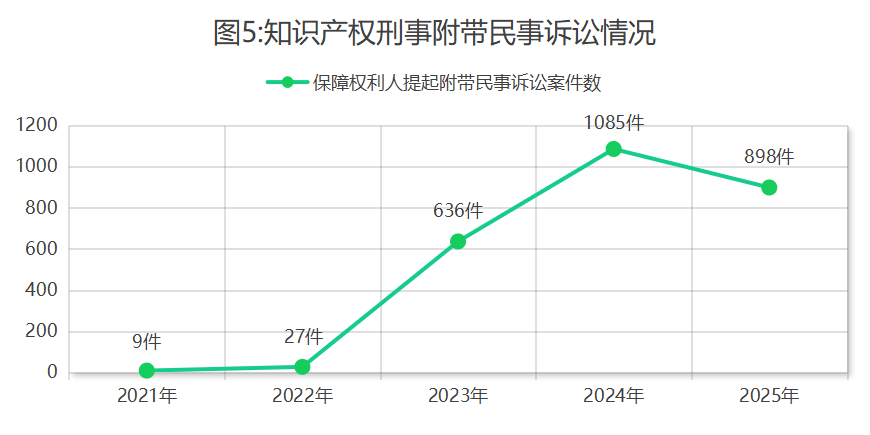 4.促成学问产权刑事附加平易近事诉讼。告状的加害学问产权坐法案件中,保证权力人提起附加平易近事诉讼898件,占比9.8%,无效落矮维权利润,加重权力人诉乏。